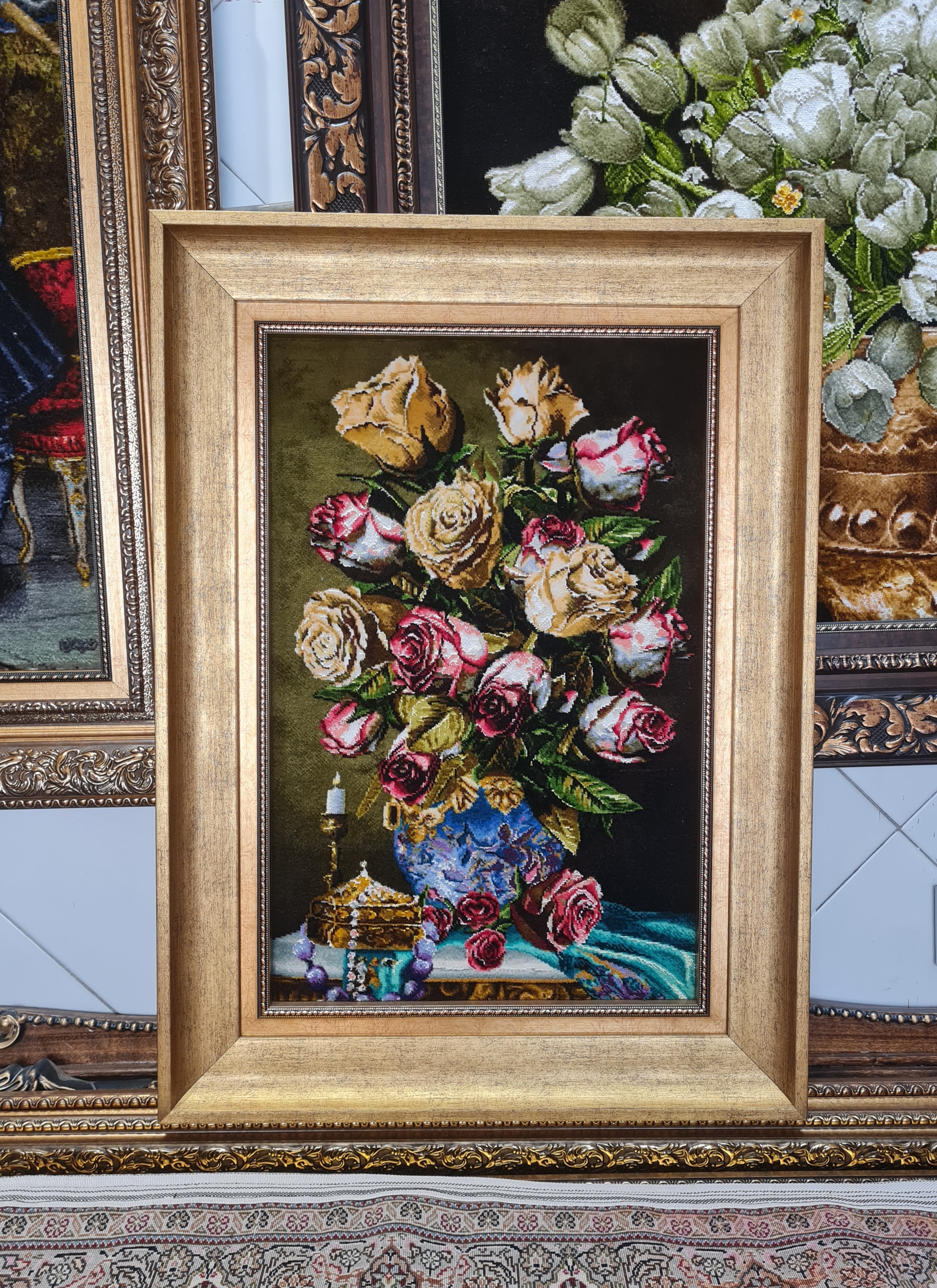 تابلو فرش دستباف تبریز طرح گلدان رز درشت کادویی فوق العاده با قیمت مناسب اندازه با قاب : ۵۷×۷۸ اندازه بدون قاب : ۴۰×۶۰ چله نخ