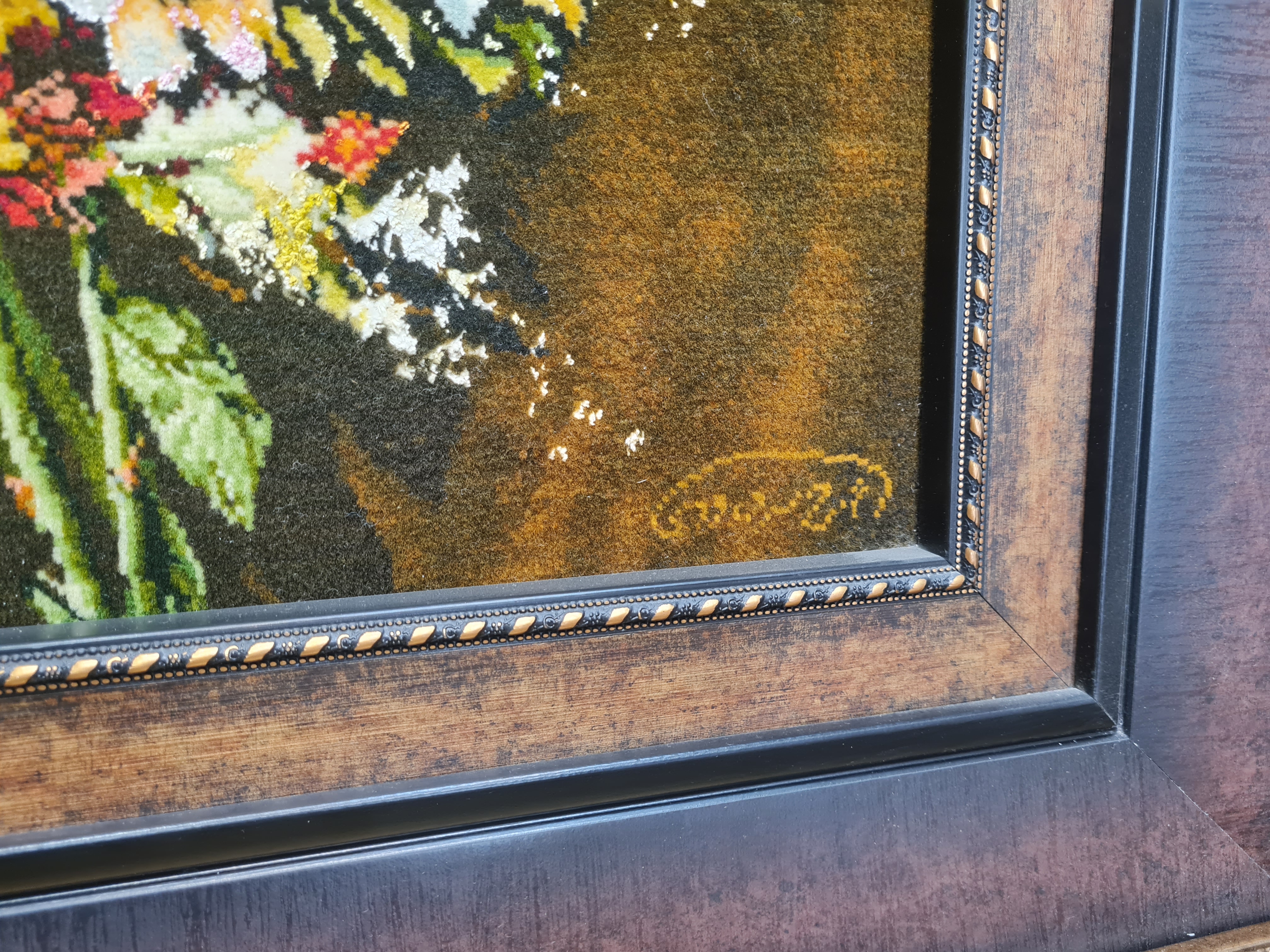 تابلو فرش دستباف طرح دسته گل طولی چله ابریشم برند سیدیان اندازه با قاب : ۶۰×۷۸ اندازه بدون قاب : ۴۰×۶۰ کار تک و درجه یک