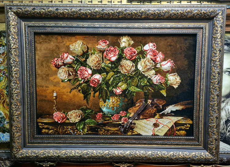 تابلو فرش گلدان گل رز مجلسی و ویالون